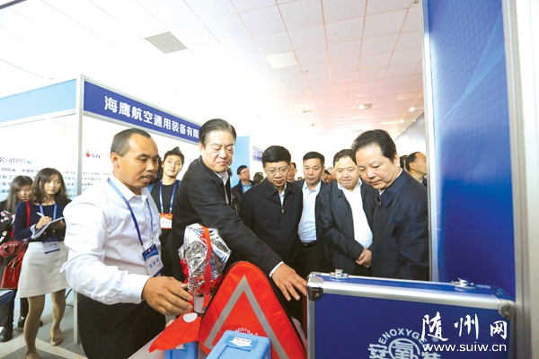 随州网讯  10月18日,工信部党组成员、办公厅主任莫玮(右四)、副省长许克振(右二)、市委书记刘晓鸣(右一)等领导和嘉宾参观应急产品和服务成果展。 (记者 徐斌摄)