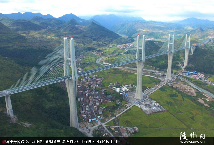 赤石大桥是厦蓉高速(厦门-成都)公路湖南段的控制性工程,桥梁设计为四塔预应力混凝土双索面斜拉桥,大桥跨越山谷1500米,主塔最高达286米,平均高度约270米,桥面距地面最高达183米,最大跨径380米,是目前世界第一大跨径高墩多塔混凝土斜拉桥。(李根)