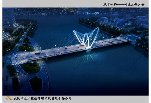 新氵厥水一桥的设计采用蝴蝶兰斜拉桥方案,设计灵感来源于我市市花——兰花。大桥整体造型设计为一朵在氵厥水河中绽放的兰花,两侧拱形主塔似伸展的花瓣,中间拱形副塔是花瓣中的花蕊。远远看去,整座桥梁又像一只翩翩起舞的蝴蝶。