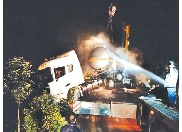 随州网讯 10月27日,洪山镇新阳店路段发生一起危化品运载车侧翻的交通事故。接警后,随县交警大队二中队全队民警立即赶赴现场处置救援。经过近10小时的努力,危化品车所运载的环己烷被安全转移,事故车辆也被拖运至安全地点,现场道路恢复通行。(通讯员 戴玉平 申腾飞摄)