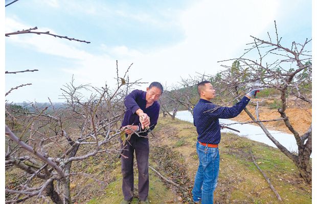 随县唐县镇华宝山村的果农提前对油桃进行清园、追肥和剪枝,确保来年果树健康成长