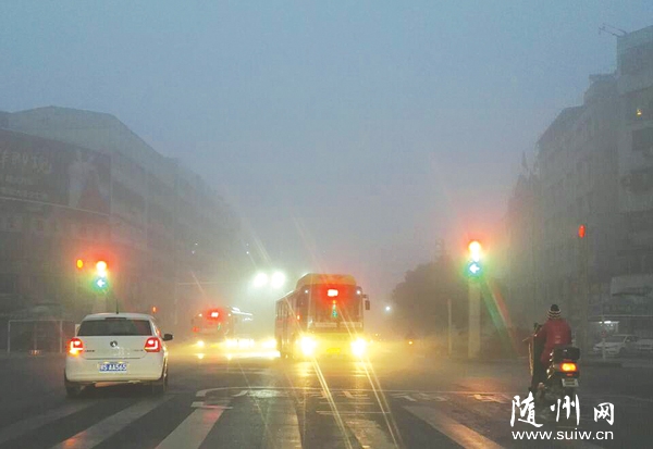 随州网讯 12月1日上午,随州市曾都区、随县出现了能见度小于500米、局部小于200米的雾。道路上,各类车辆打开雾灯,减速慢行。(本报记者 徐 斌摄)