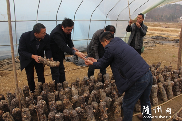 随州网讯  近日,湖北省食用菌协会会长、华农大教授边银丙(左二),到随州市九口堰富农磨菇农民专业合作社,指导灾后重建大棚内香菇生长情况。 (通讯员 刘 毓 多 思摄)