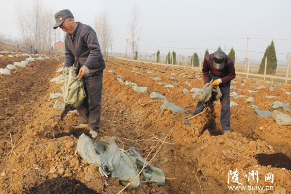 随州网讯  近日,随州市老促会帮扶的曾都区万店镇龙头湾村3组蓝莓产业园里,村民们为树窝下肥。(通讯员 石守京摄)