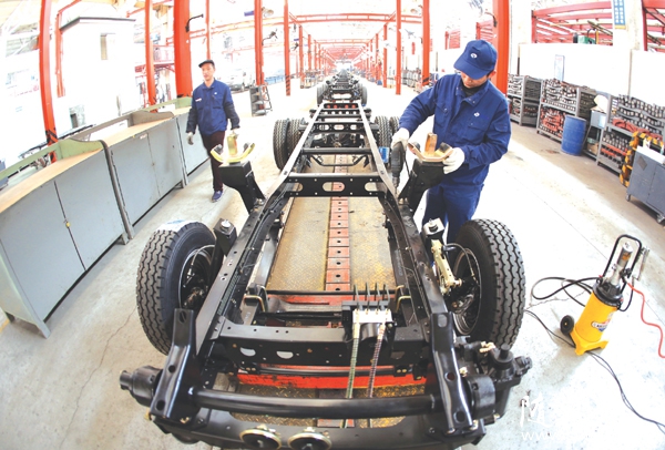 随州网讯  随州汉新汽车有限公司员工日前正在生产线上装配汽车车身。公司生产的重型汽车车身远销俄罗斯等国家。 (本报记者 孙洪涛 摄)