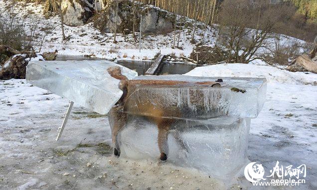 欧洲大陆近日遭遇严寒天气。在德国,有一只狐狸在掉入河中后,很快就被冻成了“冰狐”。当地人发现这只可怜的小家伙后,将整个冰块取出,并用电锯拉开,才抢出其“遗体”。(高轶军)