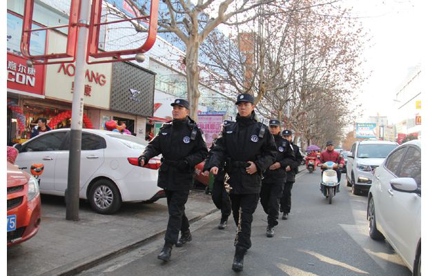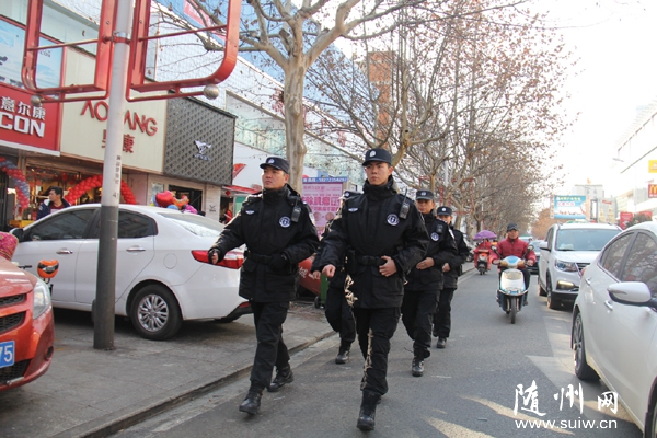 随州网讯 随州特警针对春节临近,城区盗窃案件有所上升的态势,采取定点值守、徒步巡逻和乘车巡逻等方式,加大主城区商业广场、集贸市场和重点路段、重点时段的巡防力度,努力遏制侵财案件的发生。图为1月22日,随州特警在解放路商业及人员密集区开展巡逻防控。 (通讯员 刘智明 钱耀东摄)