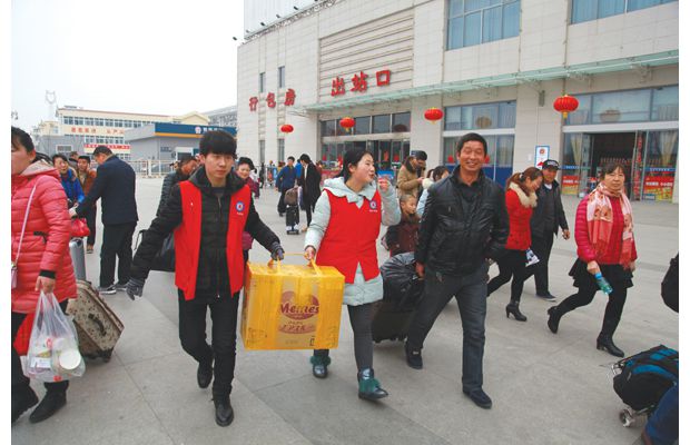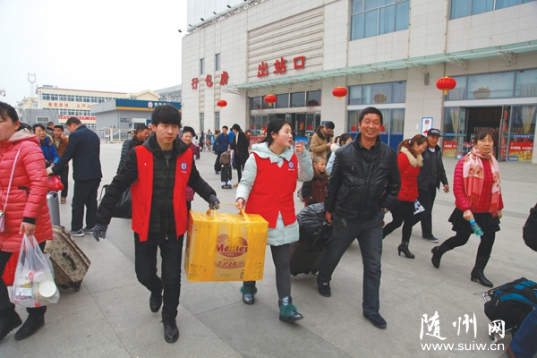 随州网讯 春运进入高峰,随州市文明办、团市委、随州火车站、随州志愿服务联合会、曾都区网格中心、曾都区巡防队联合开展“温暖回家路”志愿服务,帮助返乡群众返程。 (本报记者 王璟天 摄)