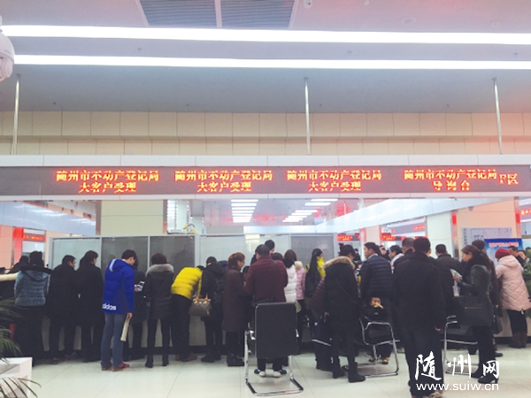 随州网讯  春节前后,随州市政务服务中心的市不动产登记局窗口迎来返乡人员办理不动产登记热潮,各类不动产登记日均办结量达197件。其中以返乡人员办理不动产证书、证明、抵押等登记业务为主。市不动产登记局加派人手,优化流程,保证及时受理、及时办结。(通讯员 李 培摄)