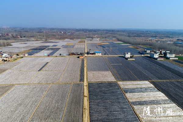 鸟瞰随县唐县镇鲁城河万亩土豆基地,犹如一幅壮观的几何图案