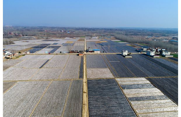 随州网讯 2月14日,鸟瞰随州市随县唐县镇鲁城河万亩土豆基地,犹如一幅壮观的几何图案。该镇发展土豆5万余亩,是远近闻名的土豆之乡,土豆远销全国各地。 (本报记者 李文军 摄)