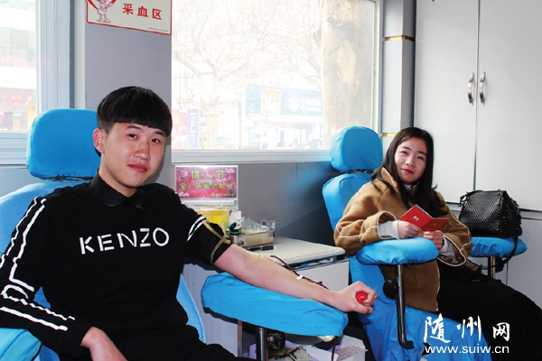 家住随县殷店镇怀南路的石成伟是在读大学生,2月14日,他特邀同学刘倬廷一起来到随城解放路献血房车上捐献血液。他说,今天献血既浪漫又有爱心,感到非常温馨和快乐。(通讯员徐勇斌刘冰冰摄)