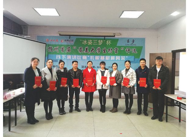 2月24日下午,随州首届“最美大学生村官”评选线下演讲比赛在随州高新区冰姿·三梦工厂店举行。15名大学生村官结合基层工作心得,通过典型、新颖、生动、感人的故事,运用动作、手势、表情和音乐、视频等方式激情演讲,充分展现了新时代大学生村官的精神风貌,获得了现场观众的一致好评。经评委团现场打分,最终根据综合得分评选出10名“最美大学生村官”,并为他们颁发了荣誉证书。