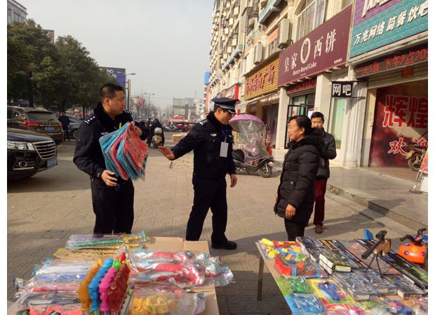 市禁鞭办联合执法组对禁鞭区部分店铺、集贸市场等进行巡查,现场查处收缴孔明灯。