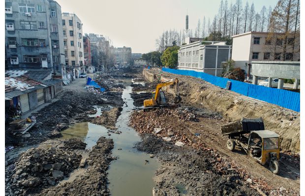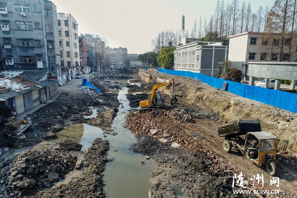 随州网讯 随州市民期盼已久的东护城河治理工程全面启动,随州城将彻底告别“龙须沟”。图为曾都区实验中学东侧的改造现场,该工程预计今年7月竣工。 (本报记者 李文军 摄)