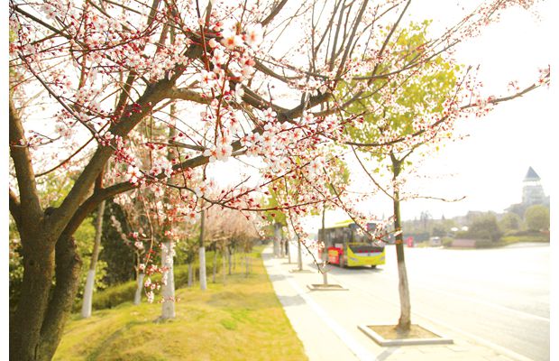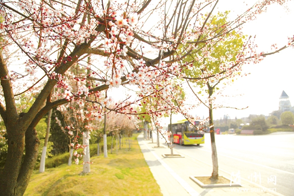 随州网讯 阳春三月,随城大地鲜花盛开。图为3月8日,城南新区白云大道旁的樱花次第开放。 (本报记者 王璟天 摄)