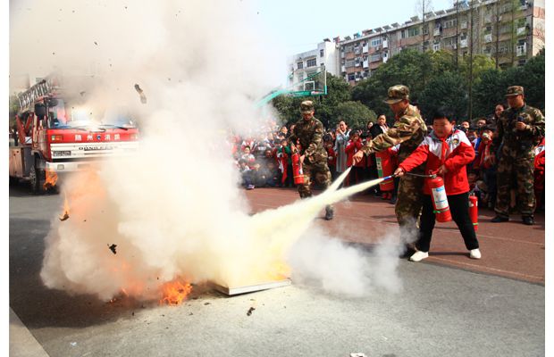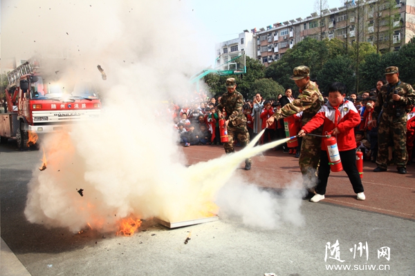 随州网讯 3月29日,随州市在曾都区实验小学举办中小学消防安全教育及逃生疏散演练。消防官兵向师生讲解消防安全知识,展示消防器材并同师生一起演练。 (本报记者 王璟天 摄)