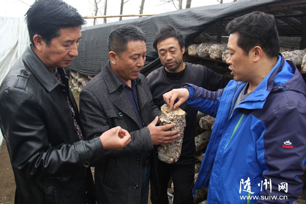 随州网讯  湖北省食用菌协会副会长、华农大副教授王卓仁(右一),日前到随州市为食用菌生产解难支招。图为他在曾都区南郊办事处马家榨村香菇种植户任少安的菇棚查看烂袋原因,提出技术建议。 (通讯员 多思 摄)