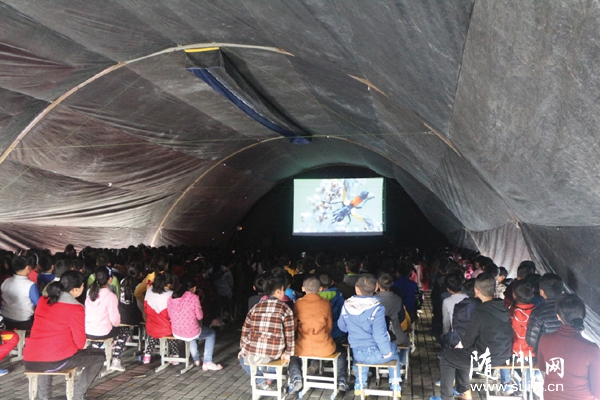 曾都区北郊五眼桥小学邀请电影公司把大型流动影院搬进校园