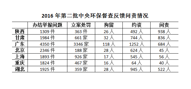 各被督察地区高度重视中央环境保护督察工作,按照边督边改要求,严查严处群众投诉环境案件。据统计,7省市问责总数超过3100人。其中,陕西省问责人数最多,达938人。其余6省市依次为甘肃问责836人,广东问责684人,湖北问责522人,上海问责56人,北京问责45人,重庆问责40人。此外,7省市共计约谈4600余人,拘留265人。