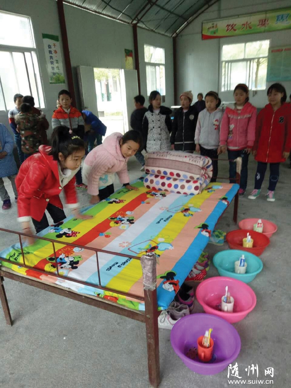 随州网讯  近日,随州市随县环潭镇河武小学举行了一场紧张激烈的内务整理比赛。被子叠成豆腐块,床单、盆、杯等铺摆成一条线。参赛的32名小选手各显其能,尽展基本功。 (通讯员 路学 彭有才摄)