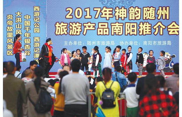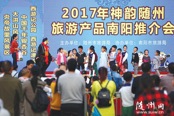 随州网讯 4月18日,“神韵随州·魅力西游”2017年西游记公园百国艺术团五省巡演推介会首站走进河南省南阳市。据悉,后期五省巡演推介将走进岳阳、九江等周边五省三十多个城市,推介随州旅游。 (本报记者 徐 斌摄)