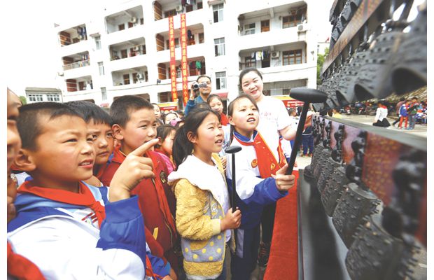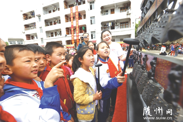 随州网讯 5月8日,随州博物馆“百馆微展览五进(走进学校、走进社区、走进乡村、走进军营、走进企业)”活动首站走进随县殷店镇中心小学,图为学生们敲击曾侯乙编钟复制件,感受世界第八大奇迹的魅力。 (本报记者 徐斌摄)