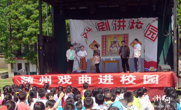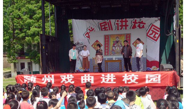 随州网讯 随州市文化体育新闻出版广电局、随州高新区社会事业局、文化馆等单位日前开展戏曲进校园活动,让学生们领略随州“花鼓戏”的艺术魅力,激发学生学习传统戏曲和舞蹈艺术的热情。 (本报记者 孙洪涛 通讯员 王涛 摄)