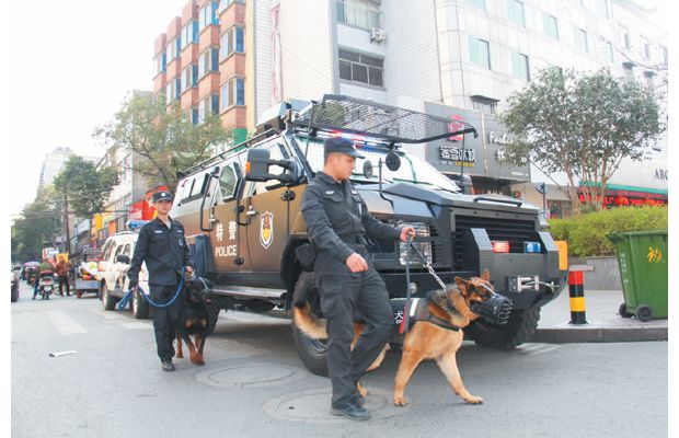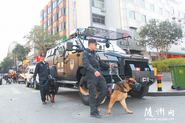 随州网讯 随州特警紧贴“寻根节”担负特殊安保任务,组织开展“人犬合一”协同作战训练和警犬驱散、警戒、抓捕等实战演练,着力提升社会整体防控能力,确保丁酉年寻根节治安平稳。图为5月15日,随州特警在主城区开展巡逻防控。 (通讯员 刘智明 金锐摄)