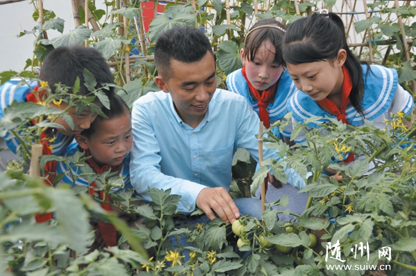 随州网讯 “我们的太空蔬菜结果啦!”6月5日,随州市随县尚市镇净明小学的学生们在老师的带领下,近距离观察太空番茄长势情况。今年,该校获得国家科协提供的太空种子,有黄瓜、番茄、辣椒等品种,在孩子们的精心培育下,如今这些蔬菜长势良好。(特约记者 江开军 通讯员 汪家旺摄)
