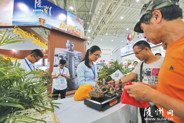 随州网讯 6月9日至11日,第九届华中旅游博览会暨第二届长江旅游博览会在武汉国际博览中心开幕,我市各大景点组团参展,图为游客在随州馆前参观咨询。(本报记者徐斌摄)