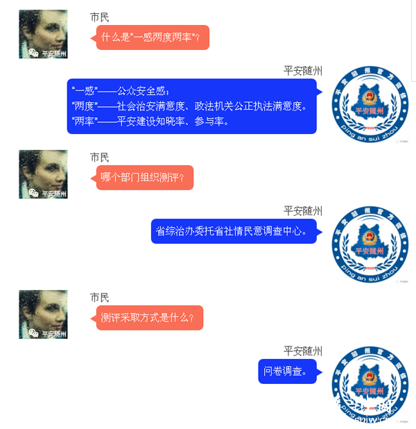 平安不平安,群众说了算。近期,2017年上半年“一感两度两率”测评就要开始啦!今年的测评与以往略有不同,省里将派出调查组来随进行暗访,随机抽取调查对象填写调查问卷。如果抽中了您,真的要恭喜您成为我们平安随州建设的代言人,希望亲们客观公正地评价我们的综治工作和政法队伍,因为您的回答将直接影响着随州的整体形象和各方对随州发展的信心,关乎着随州未来发展的前景。