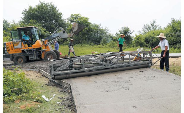 随州网讯 随州市曾都区府河镇四五咀村五组日前机声隆隆,工作人员顶着烈日加紧施工,一派热火朝天的景象。今年以来,随州市曾都区纪委驻村扶贫工作队和四五咀村委会加大脱贫攻坚力度,投资38万元,硬化通组公路2公里,方便群众出行。(特约记者 刘金伟摄)