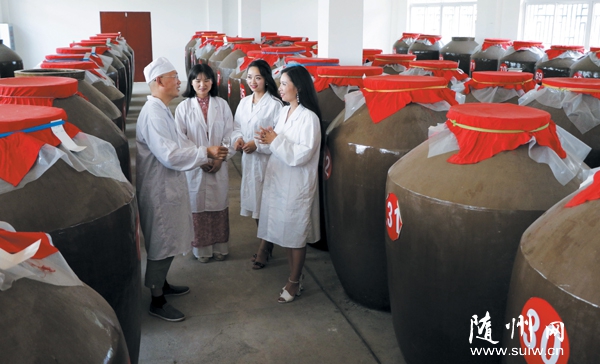 随州网讯 万福酒业公司致力打造集酿酒、科研、旅游、文化为一体的新型白酒企业。图为公司酿酒师向游客介绍酿酒知识。(本报记者 孙洪涛摄)