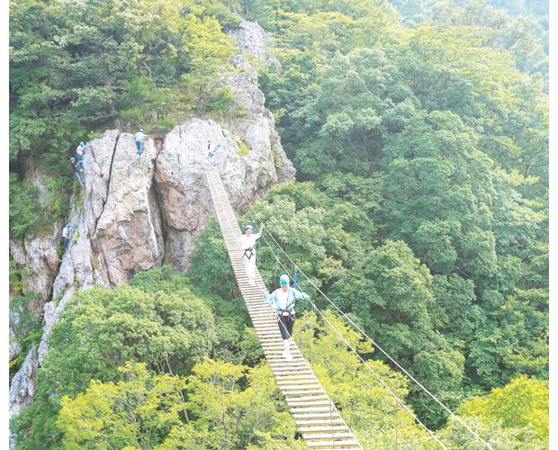 向剑口瀑布走去,一路上,陡峭的 岩、飞泻的瀑布、横卧的乱石、苍劲的青松融为一体。在数十米高的崖壁上,多出了一条弯弯曲曲长达225米的岩壁道路,上面是固定的钢索,下面是铁圈脚踏和扶手,从剑口瀑布脚下开始攀登,环绕瀑布四周的岩壁,飞跃剑口瀑布上方,最后登至瀑布上方数十米高的顶峰,穿越百米多长的吊桥到达终点。