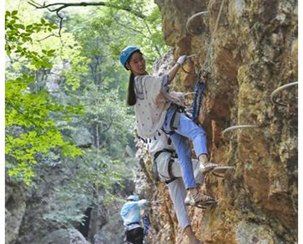 “想不想在空中一览剑口瀑布美景?”刚用40分钟挑战完丛林飞跃项目,安全教练告诉我们,还有更加刺激的“飞拉达”项目在等着我们。飞拉达是意大利文(岩壁探险或铁道式攀登)的音译,指的是在山面上建设,由铁扶手横梯、固定缆索、岩石塞、踏脚垫等构成的爬山径道,让爬山者不会攀岩也能攀上陡峭的岩壁。剑口飞拉达是华中首家户外轨道攀登项目,该项目引进欧洲技术打造。