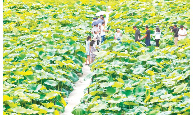 塘内荷叶亭亭如盖,红白两色荷花,或含苞待放,或肆意怒放……眼下,在大洪山风景名胜区东北部的长岗镇黄木淌村,“花果海”农业项目基地的荷塘荷花花开正好,游客们或驻足欣赏荷花,或与荷花合影,一派热闹的景象。