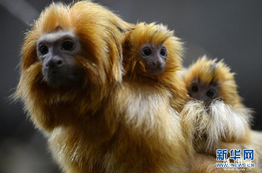 这是414日在俄罗斯新西伯利亚动物园里拍摄的金狮面狨和幼仔。新华社/卫星社