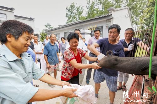 随州网讯 7月12日,由博裕生态养殖有限公司提供的112头生态黑土猪运送到大洪山长岗镇庹家村和喻家湾村79户贫困户家中。(本报记者 徐斌 实习生 潘雨薇摄)