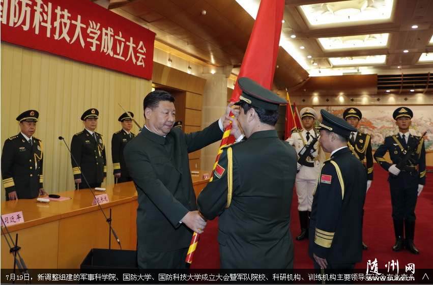 新华社北京7月19日电(记者曹智)新调整组建的军事科学院、国防大学、国防科技大学成立大会暨军队院校、科研机构、训练机构主要领导座谈会19日在北京八一大楼举行。中共中央总书记、国家主席、中央军委主席习近平向军事科学院、国防大学、国防科技大学授军旗、致训词,出席座谈会并发表重要讲话,强调要忠实履行党和人民赋予的使命,以党在新形势下的强军目标为引领,贯彻新形势下军事战略方针,推进政治建军、改革强军、依法治军,全面实施科技兴军战略,坚持面向战场、面向部队、面向未来,建设世界一流的军事科研机构、综合性联合指挥大学、高等教育院校,努力开创军事人才培养和军事科研工作新局面,为实现中国梦强军梦不断作出新的更大的贡献。