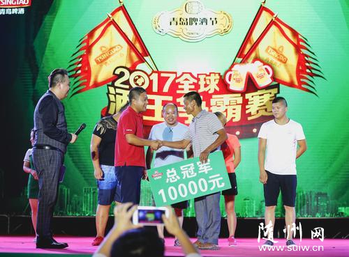 7月23日,随州第四届青岛啤酒节落下帷幕。图为本届啤酒节酒王争霸赛随州酒王获得价值1万元消费劵。为期10天的啤酒节期间,近6 万市民光顾随州青岛啤酒广场,共消费啤酒5万罐。(记者  徐斌摄影))