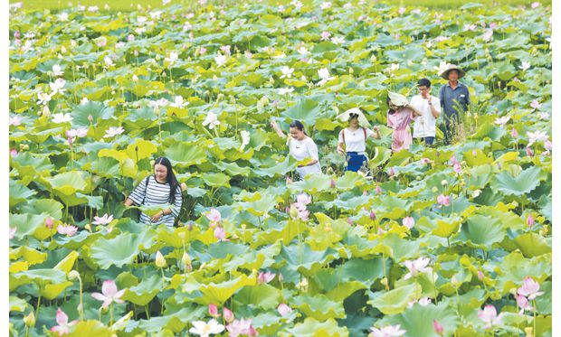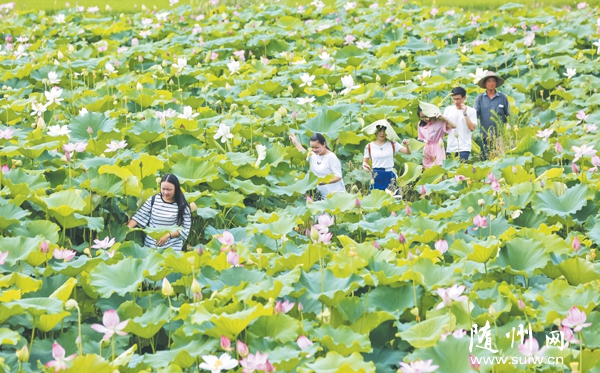 随州网讯 随县吴山镇铁山村五组农民刘常军在铁山景区附近流转土地50亩种植莲藕,发展生态观光采摘,每亩可带来近万元收益。(本报记者 徐 斌 实习生 潘雨薇摄)