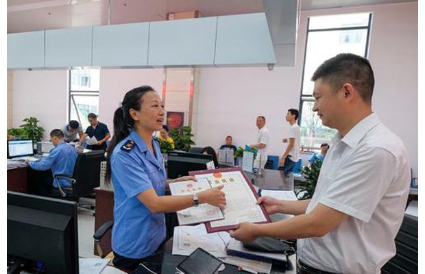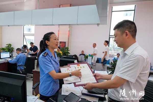 随州网讯 8月1日,湖北银行随县支行负责人在市政务服务中心市工商局服务窗口领取了我市首份“29证合一”营业执照。据悉,市工商局积极开展“多证合一”改革,在全省“27证合一”改革的基础上,结合我市实际,率先实行“29证合一”,将工商营业执照、税务登记、组织机构代码等实行“多证合一、一照一码”,实现企业一证走天下,受到企业的欢迎和认可。(本报记者 李文军摄)