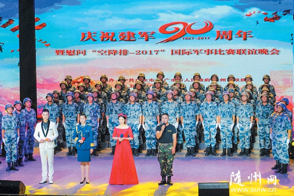 随州网讯 记者 包东流报道:8月1日晚,在《战鼓出征》铿锵鼓点声中,庆祝中国人民解放军建军90周年暨慰问“空降排- 2017”国际军事比赛联谊晚会在广水市拉开帷幕。来自伊朗、哈萨克斯坦、摩洛哥、俄罗斯、南非、委内瑞拉等国家的国际友人们与驻鄂部队官兵、地方群众欢聚一堂,共同欢庆中国人民解放军建军90周年,迎接“空降排- 2017”国际军事比赛的举行。