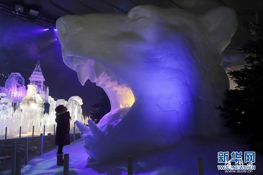 在英国伦敦海德公园,一名小观众在“冬季仙境·魔法冰王国”冰雕展上观赏冰雕。 新华社/路透