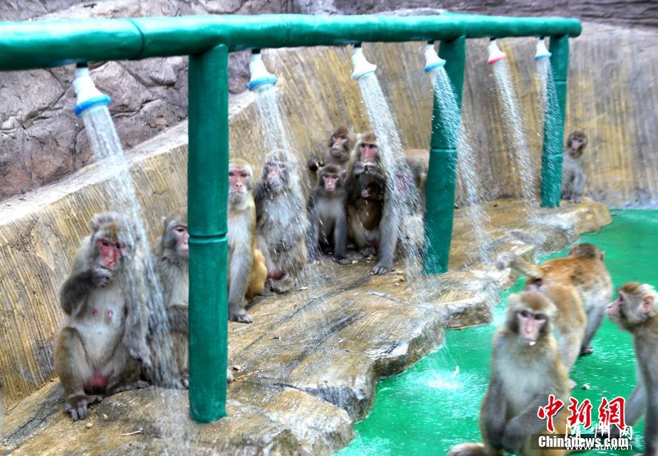 201783日,河南济源,高温天气炙烤着大地,令那些长着毛绒绒长毛的猕猴们有点吃不消,河南济源五龙口,上百只野生猕猴聚集在护林人员布置的水管下洗淋浴消暑纳凉甚是享受。这里常年生活的太行猕猴有163800余只,太行猕猴是我国最大的猕猴群落。图为野生猕猴们感受淋浴带来的清凉。王中举