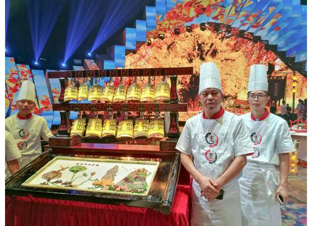 展示冷拼“随州如此多娇”还加入了一套编钟食雕,用冬瓜做食材,雕成象形编钟挂在木制编钟架上,造型逼真,镂空编钟里面配上灯光,金碧辉煌,引人注目。