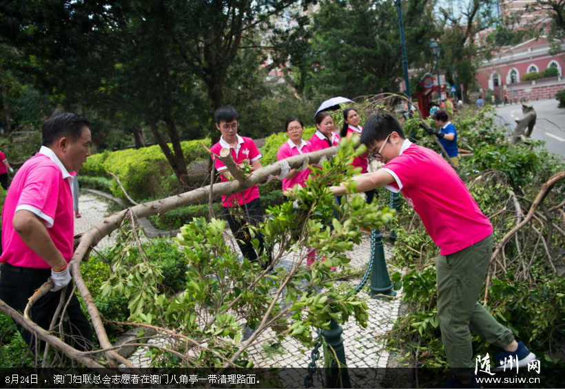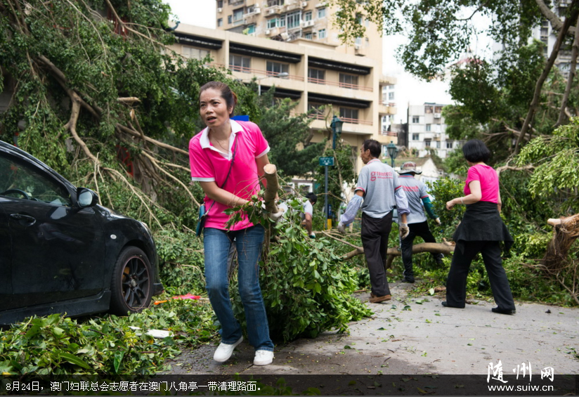 8月23日,强台风“天鸽”近距离过境澳门,导致树木倒伏超过4000棵。灾后,澳门妇联总会组织志愿者清理路面。新华社发