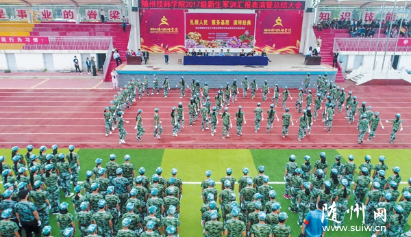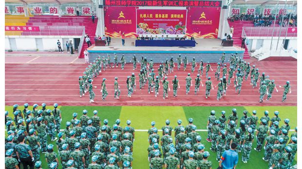 随州网讯 开学以来,随州市数千名大、中学生陆续开展军训活动,以增强学生集体意识、纪律意识和国防意识,培养学生吃苦耐劳、团结拼搏的精神。图为9月4日随州技师学院新生军训汇报表演时的场景。(本报记者 李文军摄)