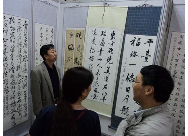 随州网讯 10月2日,广水举办“喜迎十九大、共圆中国梦”书法展暨第二届飞凌民间文化艺术品博览会。近80幅讴歌中国共产党、讴歌社会主义、讴歌党的十九大胜利召开的名家书法精品,为本次展会增添了浓墨重彩的一笔。(通讯员 刘晓斌摄)
